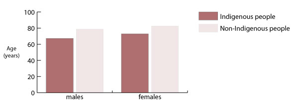 One way of looking at how common a disease is in a population is by calculating a ‘rate‘. A rate is the number of cases of a disease divided by the population, for a specific amount of time. By calculating rates, you can compare how common a disease is in different populations (like Indigenous and non-Indigenous people) or between sexes (men and women). You can also calculate rates for deaths, which lets you compare the number of deaths in two different populations. There is a special calculation for ‘infant mortality rates‘. To calculate this rate, the number of infants (children under one year of age) who died in one calendar year is divided by the number of live births in the same year. What is known about Indigenous deaths?Indigenous people are much more likely than non-Indigenous people to die before they are old [11][12]. The most recent estimates from the ABS show that an Indigenous male born in 2005-2007 was likely to live to 67.2 years, about 11.5 years less than a non-Indigenous male (who could expect to live to 78.7 years) (Figure 2) [11]. An Indigenous female born in 2005-2007 was likely to live to 72.9 years, which is almost 10 years less than a non-Indigenous woman (82.6 years). (In 2010, the ABS changed the way it calculates Indigenous life expectancy, so recent estimates cannot be compared with older estimates.) Figure 2. Expectations of life at birth for Indigenous and non-Indigenous males and females 2005-2007