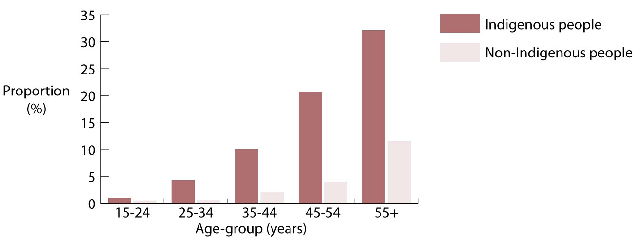 There are a number of ear diseases, but the most common is called otitis media (OM) [49]. OM is an ear disease where the middle ear is affected by infection from bacteria or viruses. OM can be very painful and sometimes damages the ear drum and fluid can leak from the ear (known as ‘runny ear’). In another type of OM, fluid builds up in the middle ear without damaging the ear drum (‘glue ear’). Both types of OM can cause hearing loss. Ear disease is associated with people living in crowded homes (particularly with people who smoke), living in poor conditions, or having poor hygiene. Children who go to day-care centres are often more likely than others to get ear infections. The 2008 NATSISS found that one-in-ten Indigenous children had ear or hearing problems [48]. In the 2004-2005 NATSIHS, ear/hearing problems were reported by one-in-eight Indigenous people (which was the same as for non-Indigenous people) [15]. Indigenous people, especially children and young adults, have more ear disease and hearing loss than do other Australians [49][50]. The 2004-2005 NATSIHS reported that OM was much more common for children than adults, and it was more common for Indigenous children than for non-Indigenous children [15]. OM was more common for Indigenous people living in remote areas (4%) than for those living in non-remote areas (2%). Indigenous people were three times more likely than non-Indigenous people to have had OM as a long-term health condition. The 2004-2005 NATSIHS found that almost one-in-ten Indigenous people were partially or completely deaf [15]. Partial or complete deafness was more likely to affect Indigenous people than non-Indigenous people aged less than 55 years, but the rates were similar for Indigenous and non-Indigenous people aged 55 years and older. The WAACHS found that almost one-in-five Indigenous children had recurring ear infections (ear infections that keep coming back) [47]. Young children (0-11 years) were more likely to have recurring ear infections than were older children (12-17 years). Hearing that wasn’t normal was reported by their carers for 7% of Indigenous children. There is a strong link between recurring ear infections and abnormal hearing: 28% of children who had recurring ear infections with discharge (runny ears) also had abnormal hearing, compared with 1% of those without ear infections. In the NT in 2007-2012, two-out-of-three Indigenous children who had child health checks with an ear, nose and throat examination had at least one middle ear condition [51]. For Indigenous children who had a follow-up hearing test, more than one-half had hearing loss in at least one ear. What is known about oral health in the Indigenous population?Oral health is a term used to talk about the health of a person's teeth and gums [52]. If people have unhealthy teeth and gums they will probably have some pain; they may not be able to eat a variety of healthy foods or talk to other people comfortably. Two common oral health problems are caries and gum diseases. Caries is caused by bacteria that decay (break down) the enamel (hard outer part of the tooth); if caries is not treated the tooth will continue to decay and will eventually have to be removed. Caries is caused by eating a lot of sticky and sweet foods that let bacteria to grow and multiply. Gum disease (also known as periodontal disease) is caused by bacteria that attack the gums causing them to swell and bleed. If gum disease is not treated, the gums start to break down and the teeth will become loose because the gums won’t be strong enough to hold them in place. Gum disease is caused by poor oral hygiene (poor care of the teeth and gums). The oral health of Indigenous people is not as good as that of other Australians. The oral health of young non-Indigenous children has improved in recent years, but the oral health of young Indigenous children has generally worsened [53]. Indigenous children have more caries in their deciduous (baby) and permanent (adult) teeth than do non-Indigenous children, and their caries are often more severe. Indigenous children have more decayed, missing and filled teeth than do non-Indigenous children. In 2000-2003, Indigenous children also had more gingivitis (a mild form of periodontal disease) than did non-Indigenous children. Indigenous adults had more than twice as much caries as non-Indigenous adults, and had three times the number of decayed surfaces, which often suggests poor access to timely dental care [54]. Indigenous adults also suffered from more periodontal disease than did non-Indigenous adults. More Indigenous adults than non-Indigenous adults suffered from edentulism (losing all of their teeth), especially at younger ages. What is known about disability in the Indigenous population?Disability may affect how a person moves around and looks after themselves, how they learn, or how they communicate[55][56]. There are a lot of different kinds of disability: