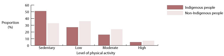 Having access to healthy foods can be a challenge for some Indigenous people who live in remote locations because food that has to be shipped over long distances is not always available, or because fresh foods may be expensive [82]. The 2004-2005 NATSIHS found that most Indigenous people ate fruit (86%) and vegetables (95%) every day [15]. Around one-in-eight Indigenous people did not eat fruit everyday (compared to one-in-14 for non-Indigenous people) and around one-in-20 did not eat vegetables every day (compared with one-in-100 for non-Indigenous people). More Indigenous people living in non-remote areas ate fruits and vegetables daily than did those living in remote areas. This may be because fruit and vegetables are more available and less expensive in non-remote areas than in remote areas. The 2004-2005 NATSIHS found that most Indigenous people drank whole milk, and only around one-in-six Indigenous people drank reduced fat or skim milk [15]. About one-half of Indigenous people usually added salt to their food after it was cooked. Physical activityKeeping physically active is important for staying healthy. Physical exercise is good for a person’s social and emotional wellbeing and reduces the risks of heart problems, diabetes, and some cancers [83]. The 2008 NATSISS found that three-quarters of Indigenous children had been active for at least one hour on every day in the week before the survey [48]. Very few children (3%) did no physical activity the week before the survey. For Indigenous adults, the 2008 NATSISS found that around one-third had taken part in physical activity or sport in the 12 months before the survey (Derived from [84]). The most recent data that can compare the physical activity of Indigenous and non-Indigenous people is from the 2004-2005 NATSIHS. This survey found that more Indigenous people than non-Indigenous people were sedentary (had very little or no exercise) [16]. One-half of the Indigenous people in the survey reported that they were sedentary compared with one-third of non-Indigenous people (Figure 7). Around one-fifth of Indigenous people and one-third of non-Indigenous people had moderate or high levels of physical activity. Figure 7. Proportions (%) of Indigenous and non-Indigenous people by levels of physical activity, Australia, 2004-2005