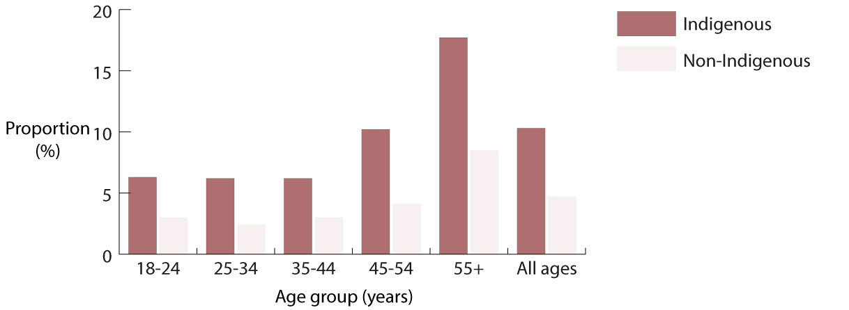 A disability that is severe and affects how a person is able to live their life is classified as a 'profound/severe core activity restriction' [57]. In 2008, one-half of Indigenous adults had some form of disability [57]. Around one-in-twelve Indigenous adults had a profound/severe core activity restriction. Disability becomes more common as people get older [25]. In 2008, disability, including profound/severe core restrictions, were more common for Indigenous adults than non-Indigenous adults in every age-group (Figure 6), and a higher proportion of Indigenous adults required assistance with a core activity from a younger age. Overall, Indigenous adults were more than twice as likely as non-Indigenous adults to have a profound/severe core restriction [57]. Figure 6. Proportions (%) of Indigenous and non-Indigenous adults with a profound/severe core restriction, by age-group (years), Australia (non-remote areas), 2008