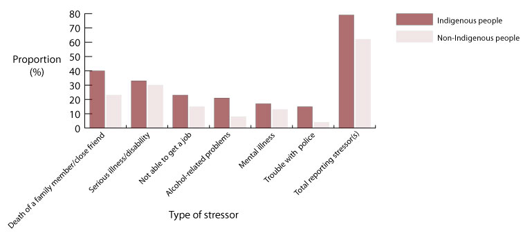 Measuring social and emotional wellbeing is difficult, but it usually relies on self-reported feelings (like happiness or calmness) or ‘stressors’ (stressful events in a person’s life). The 2008 National Aboriginal and Torres Strait Islander Social Survey (NATSISS) collected information on positive wellbeing and asked people to report on feelings of happiness, calmness and peacefulness, fullness of life, and energy levels. The survey found that most (nine-out-of-ten) Indigenous people felt happy some, most, or all of the time [25]. Around four-out-of-five Indigenous people reported feeling calm and peaceful, full of life, and that they had a lot of energy some, most, or all of the time. Similar information has not been collected from non-Indigenous people, so there is no way to compare Indigenous and non-Indigenous people's positive wellbeing. It is likely, however, that Indigenous people would report lower levels of social and emotional wellbeing overall because they experience higher levels of psychological distress and more stressors when compared with non-Indigenous people [16][26]. The 2008 NATSISS and the 2007-2008 National Health Survey (NHS) found that Indigenous adults were two-and-a-half times more likely to feel high or very high levels of psychological distress than were non-Indigenous adults [25]. Indigenous people may have higher levels of psychological distress because they experience more stressors than do non-Indigenous people. The 2008 NATSISS found that almost eight-out-of-ten Indigenous people experienced one or more significant stressors in the year before the survey interview [16]; this compared with six-out-of-ten for the total population[26]. Compared with the stressors reported by the general population in the 2010 General Social Survey (GSS), many more Indigenous people reported stressors like: the death of a family member or friend; alcohol or drug related problems; trouble with the police; and witness to violence (Figure 4) [16]. Almost one-in-five Indigenous people also reported that either themselves, a family member, or friend had been sent to jail in the previous 12 months, but this stressor was not reported by the general population. Figure 4. Proportion (%) of Indigenous and non-Indigenous people who experienced stressor(s), by type of stressor, 2008 and 2010