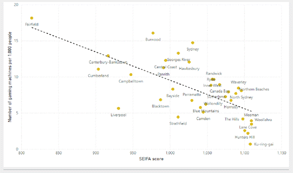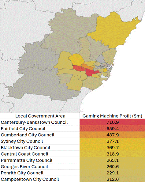 Source: Clubs gaming machine data quarterly report (the Department). Research has shown that high levels of socio-economic disadvantage are a significant risk factor for gambling-related harm and that gaming machines are often concentrated in areas with high levels of socio-economic disadvantage. Figure 7 shows the correlation between the number of gaming machines and the relative disadvantage of LGAs in Greater Sydney using the Australian Bureau of Statistics Socio-Economic Indexes for Areas (SEIFA). SEIFA summarises the economic and social conditions of people and households within an area. A low SEIFA score indicates relatively greater disadvantage. Measures include employment and household income. Fairfield, Canterbury-Bankstown and Cumberland LGAs had the highest concentration of gaming machines in 2023–24 and were ranked as the three most socio-economically disadvantaged LGAs in Greater Sydney (see Figure 7). Fairfield LGA had the highest levels of socio-economic disadvantage and the highest concentration of gaming machines. LGAs such as Ku-ring-gai, Hunters Hill and Lane Cove, in comparison, had the lowest number and concentration of gaming machines in Greater Sydney and had among the highest SEIFA scores among LGAs in Greater Sydney. In 2023–24, Ku-ring-gai LGA had one gaming machine for every 1,443 people and Fairfield had one gaming machine for every 55 people. Figure 7: Correlation between gaming machine concentration and Socio-Economic Indexes for Areas scores, Greater Sydney local government areas, 2023–24Note: The SEIFA scores are the most recent available and are based on data from the 2021 ABS Census. Source: Hotels and clubs gaming machine data 2023–24 (the Department); ABS SEIFA 2021. While gaming machines and gaming machine losses are most concentrated in the Greater Sydney region, there is also a significant gaming industry presence in regional and rural NSW. In 2023–24, around 43% of gaming machines (37,678) were located in venues outside Greater Sydney. Gaming machines outside Greater Sydney were concentrated in regional centres such as Newcastle and Wollongong. These regional centres also generated the highest profits outside of Greater Sydney. For example, Wollongong and Newcastle LGAs were ranked 12th and 13th for gaming machine profits, which were $195 million and $187 million respectively in 2023–24. NSW LGAs that have a border with Victoria have the highest concentration of gaming machines and losses by population, with the top five LGAs in regional and rural NSW by gaming machine losses per capita all including border towns (Table 2). For example, in 2023–24, Murray River Council had over 1,000 gaming machines and $78.6 million in profits. This equates to one gaming machine for every 13 people and almost $6,000 in gaming machine losses per person. In comparison, Wollongong had 2,786 gaming machines that generated $195 million in 2023–24, which equates to one gaming machine for every 79 people and $890 in losses per person. The concentration of gaming machines in areas on the southern border of NSW is influenced by the fact that these venues historically served both NSW and Victorian markets, because gaming machines were not legal in Victoria prior to the early 1990s. Current profits from gaming machines in LGAs close to the Victorian border may also be influenced by patronage from nearby Victorian towns. Table 2: Local government areas in regional and rural NSW with the highest gaming machine losses per person, 2023–24
