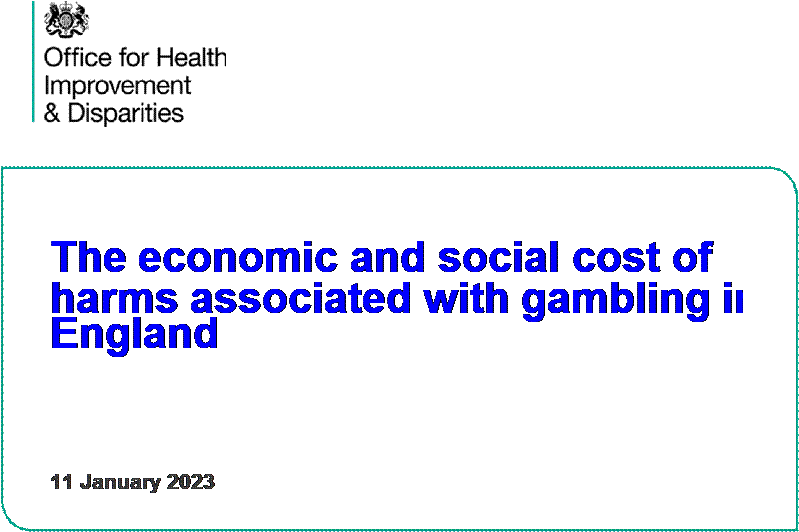 2023 updateThe gambling-related harms evidence review was published by Public Health England (PHE) in September 2021, including this economic and social cost of harms report. PHE has since been disestablished. The Office for Health Improvement and Disparities (OHID) has carried out a review and update of the work, with the aim of continuing to improve our methodology. This is a standard approach for previously published reports, and it includes an update of all the areas of analysis to reflect the current price year. This report is an updated version of the 2021 publication.