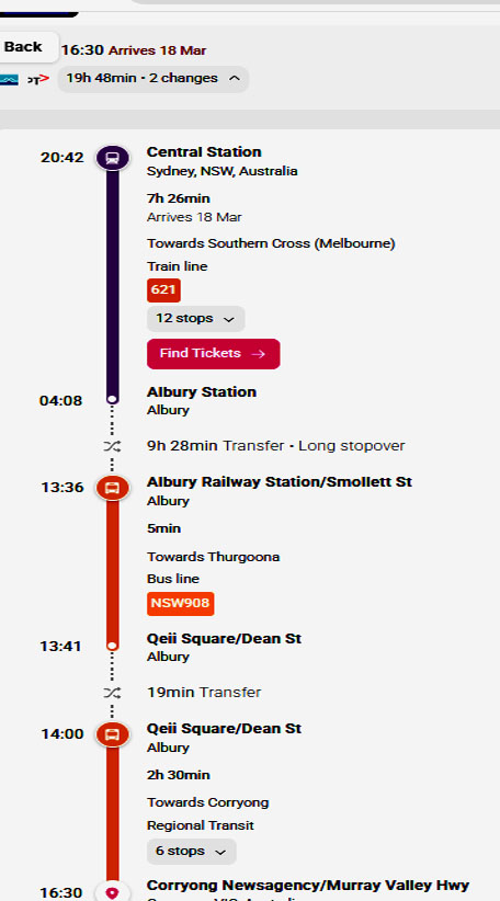 9 hrs after arriving at Albury NSW train station, catch bus east to Corryong Vic - Vic Regional Transit - 6 stops