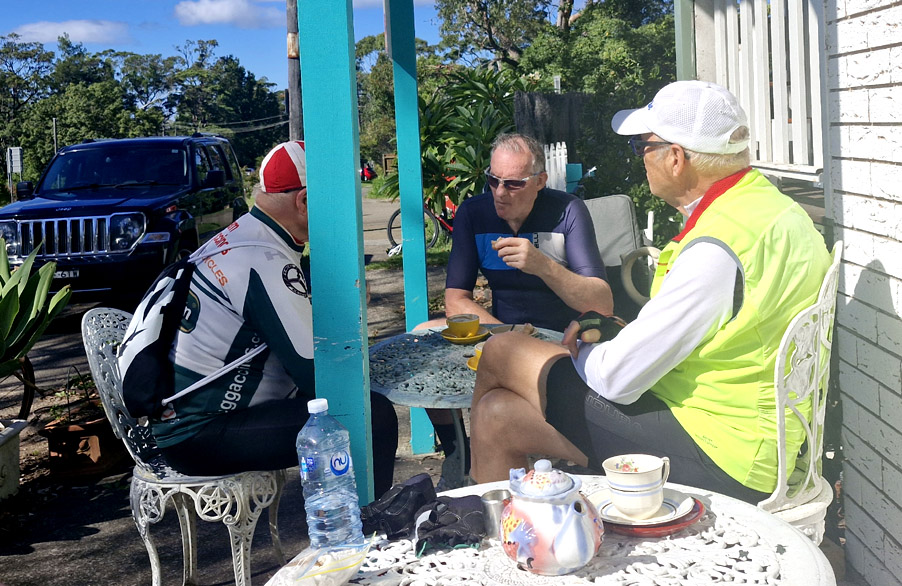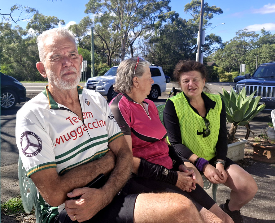 Relaxing at the Richmond Record Store Cafe after scaling the humongous Old Bathurst Rd, and then 22km Nth to Richmond Hornsby, Windsor, Richmond Choo Choo to Riverstone, thence Garfield East Rd, GG n back to Hornsby - 96km - 3 riders We took an extended ride in the pristine, lush, verdant Cornwallis, Nth Richmond Lowlands trying to clock up the ton and cause the next train East was still a ways off.
