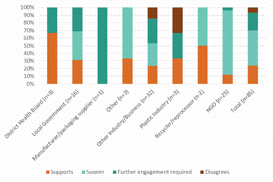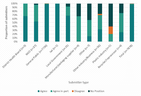 Note: The figure includes numbers from both short-form and substantive submissions. General public submitters were most likely to support the Government in taking more action on plasticsAs shown in figure 2, most respondents supported the Government in taking more action on plastics either in full or in part. Members of the public were highly likely to agree. Figure 2: Overall support for more action on plastics by submitter type