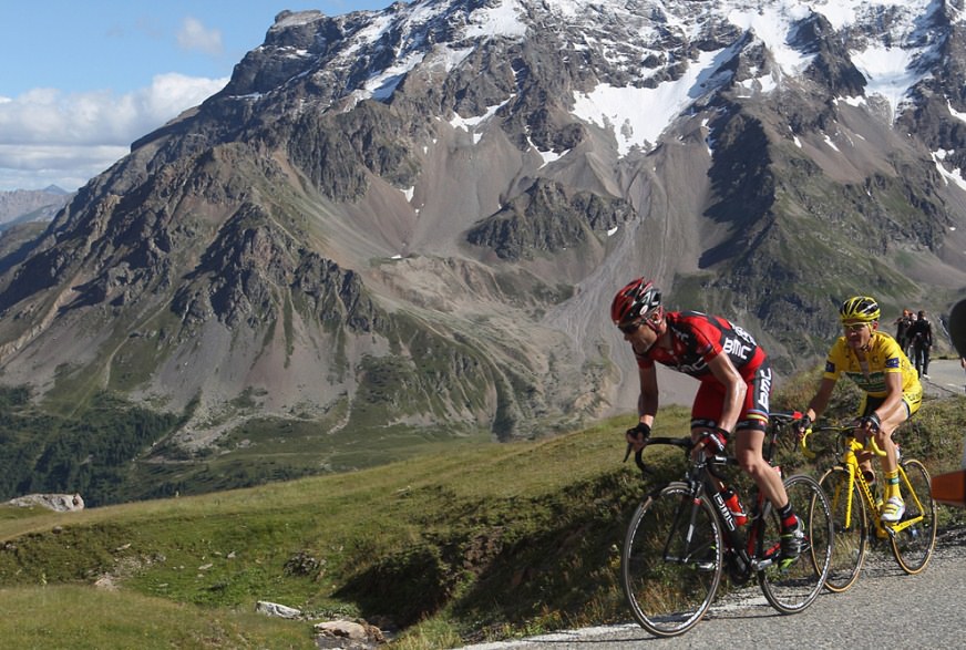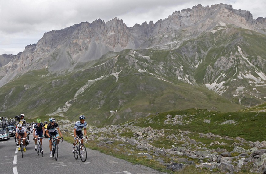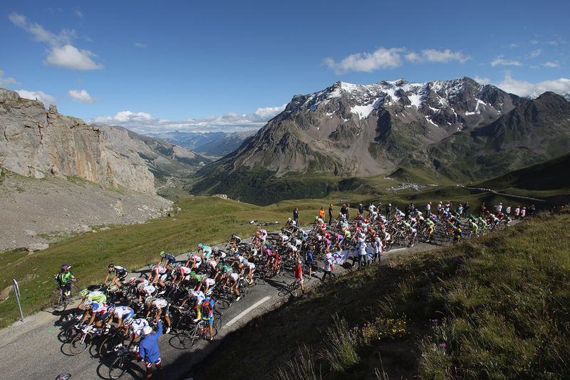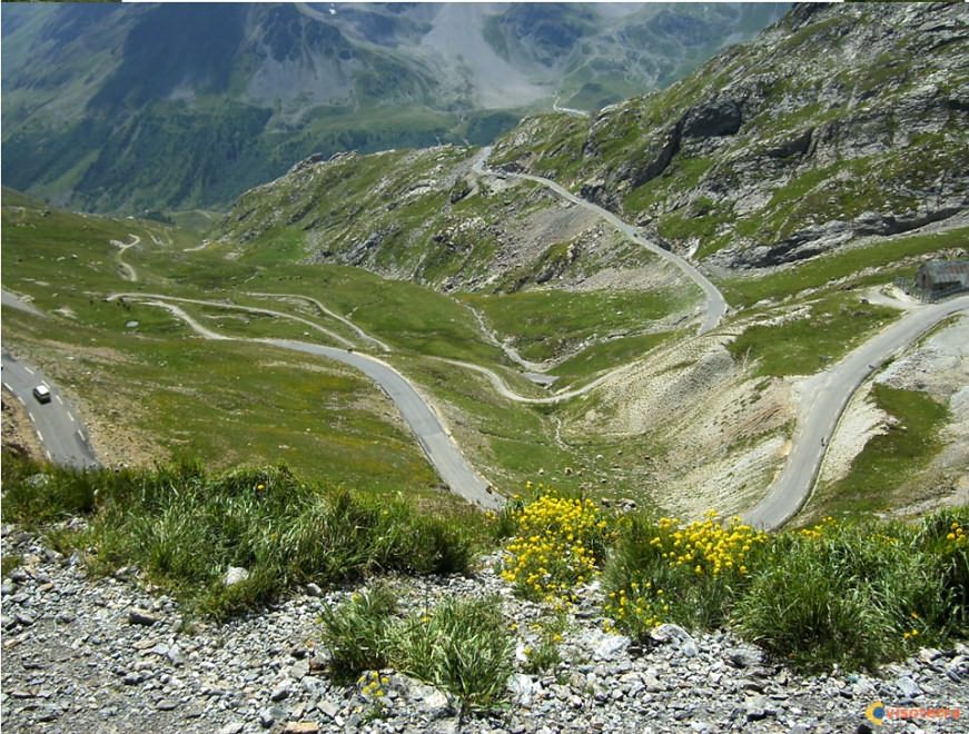 Down the mountain, a film of thin grass gives the lower slopes a veneer of life. This is the Col du Galibier.