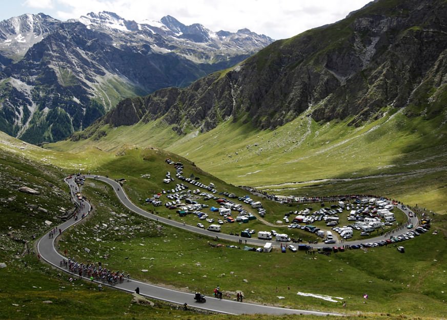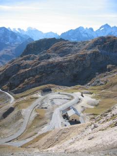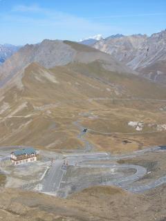 The summit is a bleak, windswept spot, a remote world of silence. At 2,646 metres above sea level, the only sound is a thin and sometimes freezing wind and the only colour is the sun-bleached and washed-out grey of the rocky scree between the hairpins. In the distance, massive jagged peaks in a 360-degree Alpine panorama.