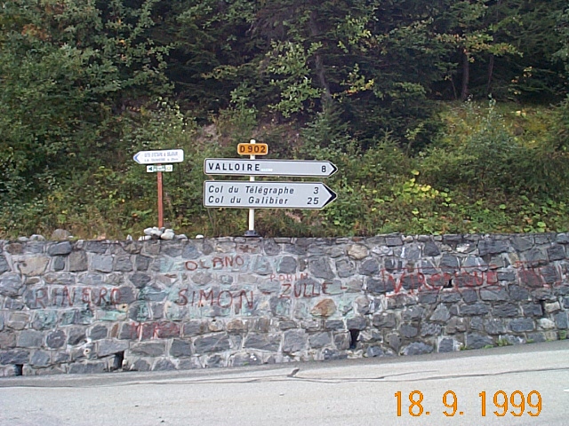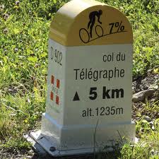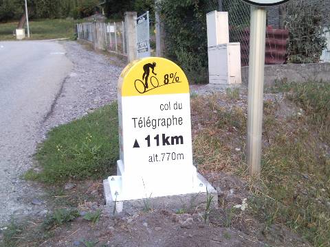 The Col du Telegraph is so named because at the very top of the climb is a series of radio and TV towers. It's a rather large cement structure that can be seen for a long way. So as you begin the climb, you can see your goal (the towers) way up the mountain.
