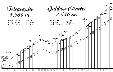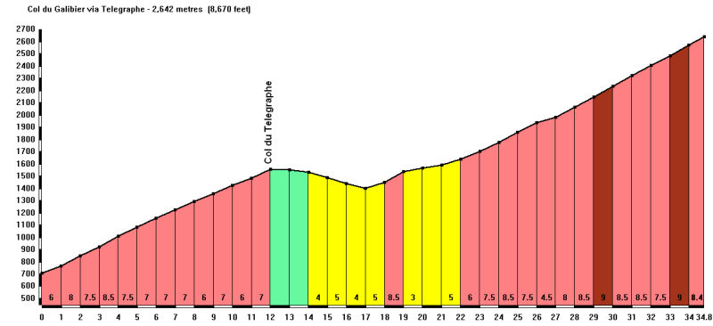 1st 12.6km from St-Michel-de-Maurienne to Col du Telegraphe (el. 1,566m) with lots of shade, then 5km descent to township of Valloire - 6.75% ave - 9% max