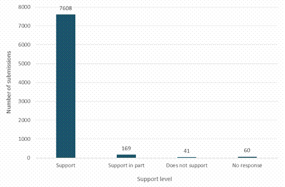 What we heard – Overall support New Zealanders want more action on plastic waste Overwhelming support for taking action on plasticsNew Zealanders showed high support for more action on plastic waste and problematic plastic items (figure 1). Of submitters, 97 per cent (7675) supported more action being taken on plastics in New Zealand. Figure 1: Overall support for more action on plastics