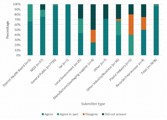 Note: The figure includes numbers from both short-form and substantive submissions. General public submitters were most likely to support the Government in taking more action on plasticsAs shown in figure 2, most respondents supported the Government in taking more action on plastics either in full or in part. Members of the public were highly likely to agree. Figure 2: Overall support for more action on plastics by submitter type