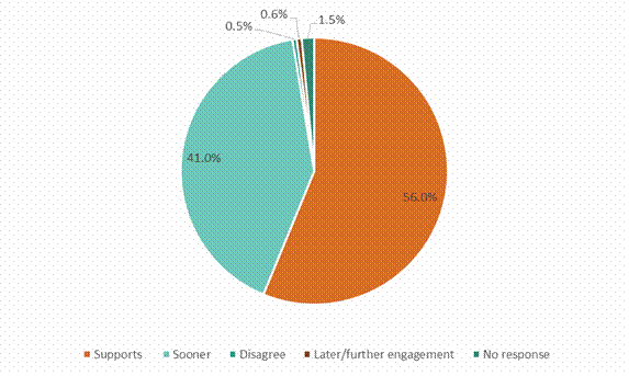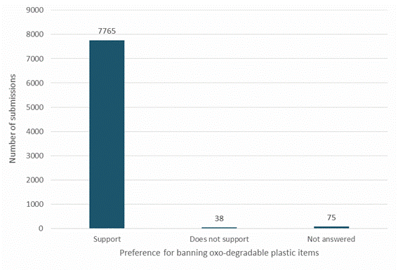 Note: The figure includes numbers from both short-form and substantive submissions. Despite the challenges some businesses and industries may face, the proposal does have support within the most affected sectors. Many have already taken steps to remove hard-to-recycle plastic packaging from their supply chains and operations. One industry and business submitter noted: Additionally, our wholesale businesses … which supply packaging products to other businesses, including the convenience, food service, and hospitality sectors, are now ranging fibre-based alternatives, and are managing a gradual exit from supplying polystyrene packaging. A mandated phase-out of these products would quicken this process as we currently compete with third-parties that pitch the cheaper polystyrene.[3] As shown in the previous figures, few submitters disagreed with proposal one and made additional comments. However, one industry group commented on practical considerations for business and industry: Members have signed up to the Plastic Packaging Declaration which sets targets for 2025. They therefore question why products should be banned before that agreed deadline. Further, without an understanding of how many companies are using PVC and PS packaging, it is difficult to understand whether the time frame is feasible. The likely costs or benefits of phasing out all PVC and polystyrene packaging needs a full and separate economic analysis. For companies that do use these products, multiple packaging lines will need replacing and often an R&D component will be needed. By the time economic insights are drawn, alternative materials and infrastructure are available, and trials are concluded the end of 2022 is impossible and even the end of 2024 is probably not achievable in totality.[4] Oxo-degradable items can easily be phased outAgreement was high that oxo-degradable plastics be phased out (figure 5). The proposal is to phase out all oxo-degradable plastics (not just for food and beverage uses) because they are simply plastics that contain chemical additives to make them break down faster into smaller plastic pieces (microplastics). They are generally not recyclable or compostable. Figure 5: Overall preferences for banning oxo-degradable plastic items The Ministry heard that oxo-degradable plastic items are a significant point of confusion for people, with some not understanding what the term means or how to dispose of these items correctly. One general public submitter noted: … the green-washing associated with these products threatens to undermine the public education that is required to make reuse and recycling models more efficient and free of contaminants.[5] Another submitter captured the confusing nature of oxo-degradable plastics stating: You think you are buying ones that decompose but they are actually still made of petroleum products that just break down into micro plastics. Oxo degradable plastics gone forever ASAP please.[6] Oxo-degradable plastics cause public confusion and are relatively new in the New Zealand market. This provides New Zealand with an opportunity to remove these items from its system before they become too widespread. Most submitters support proposed timeframes, many wanted faster actionThe Government proposed the following staged approach to phasing out hard-to-recycle plastics. This is to ensure manufacturers and businesses have adequate time to shift their packaging to sustainable alternatives, while also balancing environmental impacts. Stage 1 – soon (2023): · all food and beverage PVC packaging · some food and beverage items that contain PVC packaging · all oxo-degradable plastic items. Stage 2 – later (2025): · all food and beverage items that contain polystyrene packaging not captured in Stage 1 · all expanded polystyrene (EPS) packaging. Overall, 56 per cent of submitters supported the proposed staged phase-out timeframes of 2023 to 2025 for PVC and polystyrene food and beverage packaging (figure 6). A significant portion of submitters (41 per cent), however, wanted faster action, many preferring a 12‑ or 18‑month phase-out period for all in-scope items. Others called for it to happen as soon as possible. Note: The figure includes numbers from both short-form and substantive submissions. Industry and business submitters favour a longer lead-in timeFigure 7 shows that some industry and special interest groups are concerned about the proposed timeframes. They want more time to consider the options, or further engagement with government, suppliers and retailers, to find appropriate and sustainable alternatives. Note: The figure includes numbers from both short-form and substantive submissions (excluding submissions received from general public submitters). Manufacturers, the plastic industry, and other industry and business submitters were most likely to either want more time before phase outs come into force or signalled no support for the proposed timeframes. As discussed in the following sections, some of the concerns raised by individual industries or businesses are related to specific items or uses for PVC and polystyrene in food and beverage packaging, rather than an overall disagreement with taking action on problematic plastics. Some items are more challenging to phase out, requiring a longer lead-in timeAlthough most submitters supported more action on plastics, some applications for PVC and polystyrene food and beverage packaging present unique challenges to manufacturers, producers, recyclers and consumers. TimeframesWe heard calls to stage certain phase outs later than the proposed timeframes, to allow business and industry to find suitable alternatives to specific items that are challenging to phase-out within the proposed categories (PVC and polystyrene). This was echoed by a local government submitter who noted: PVC and PS/EPS are used for packaging for high value products, medications and to ensure food products are kept at suitable temperatur